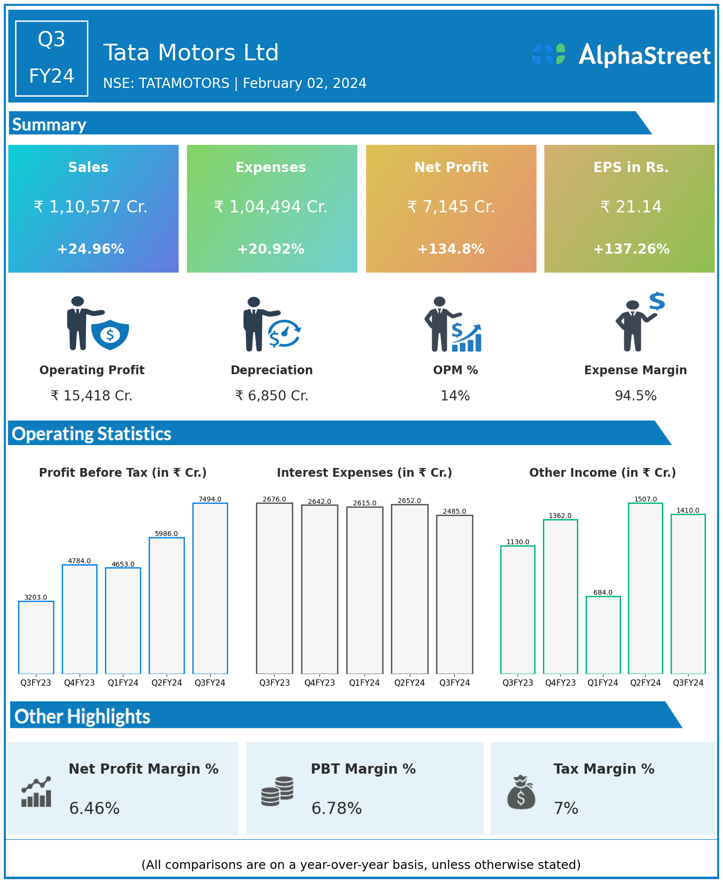 Tata Motors Ltd reported Revenues for Q3FY24 of ₹1,10,577.00 Crores up from ₹88,489.00 Crore year on year, a rise of 24.96%.