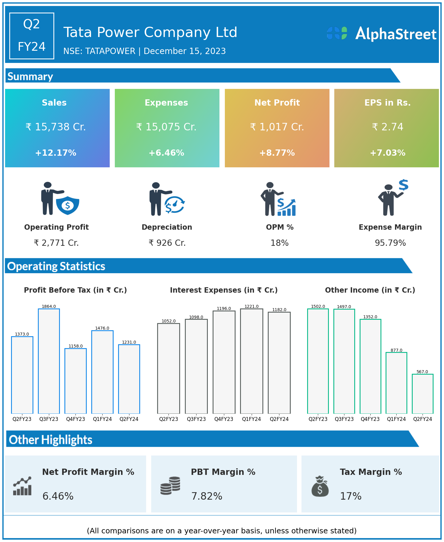 Tata Power Company Ltd reported Revenues for Q2FY24 of ₹15,738.00 Crores up from ₹14,031.00 Crore year on year, a rise of 12.17%.