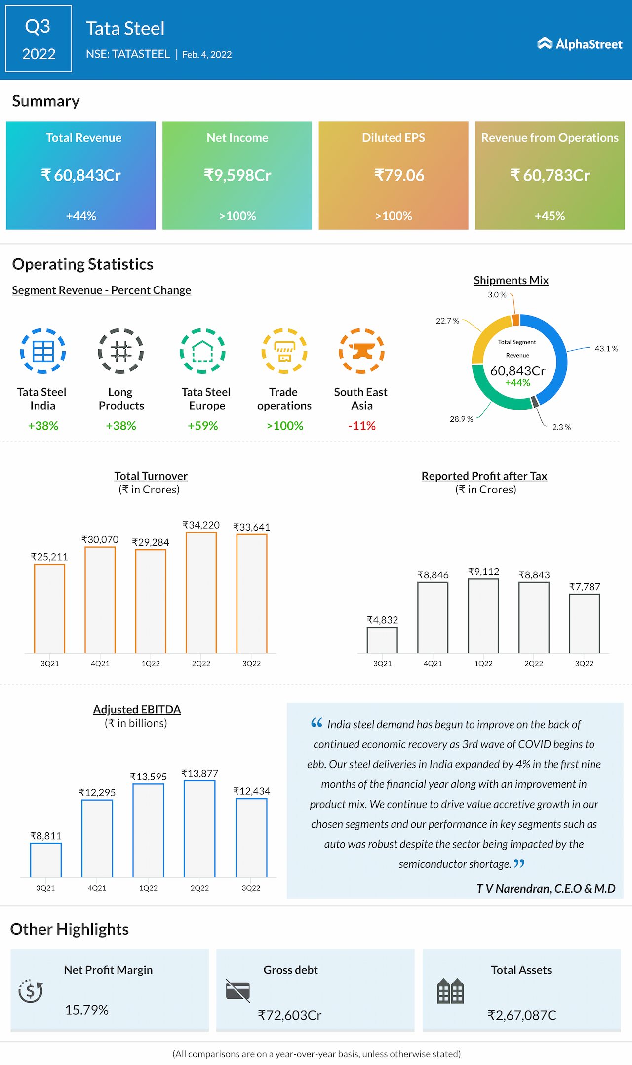 - Samita Shah asked a chat question about the medium term pricing outlook on steel prices globally. T V Narendran MD said it believe that the steel prices going forward will be at a much higher level than seen in the last 10 years. It will continue to be volatile, as like last one year, but it will be volatile at a much higher level than seen in the last 10 years.