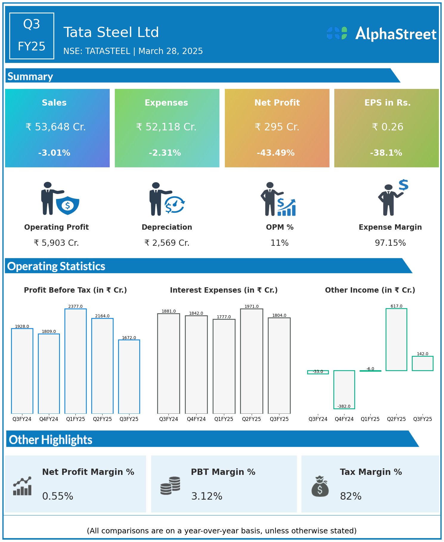 Tata Steel Ltd reported Revenues for Q3FY25 of ₹53,648.00 Crores down from ₹55,312.00 Crore year on year, a fall of 3.01%.