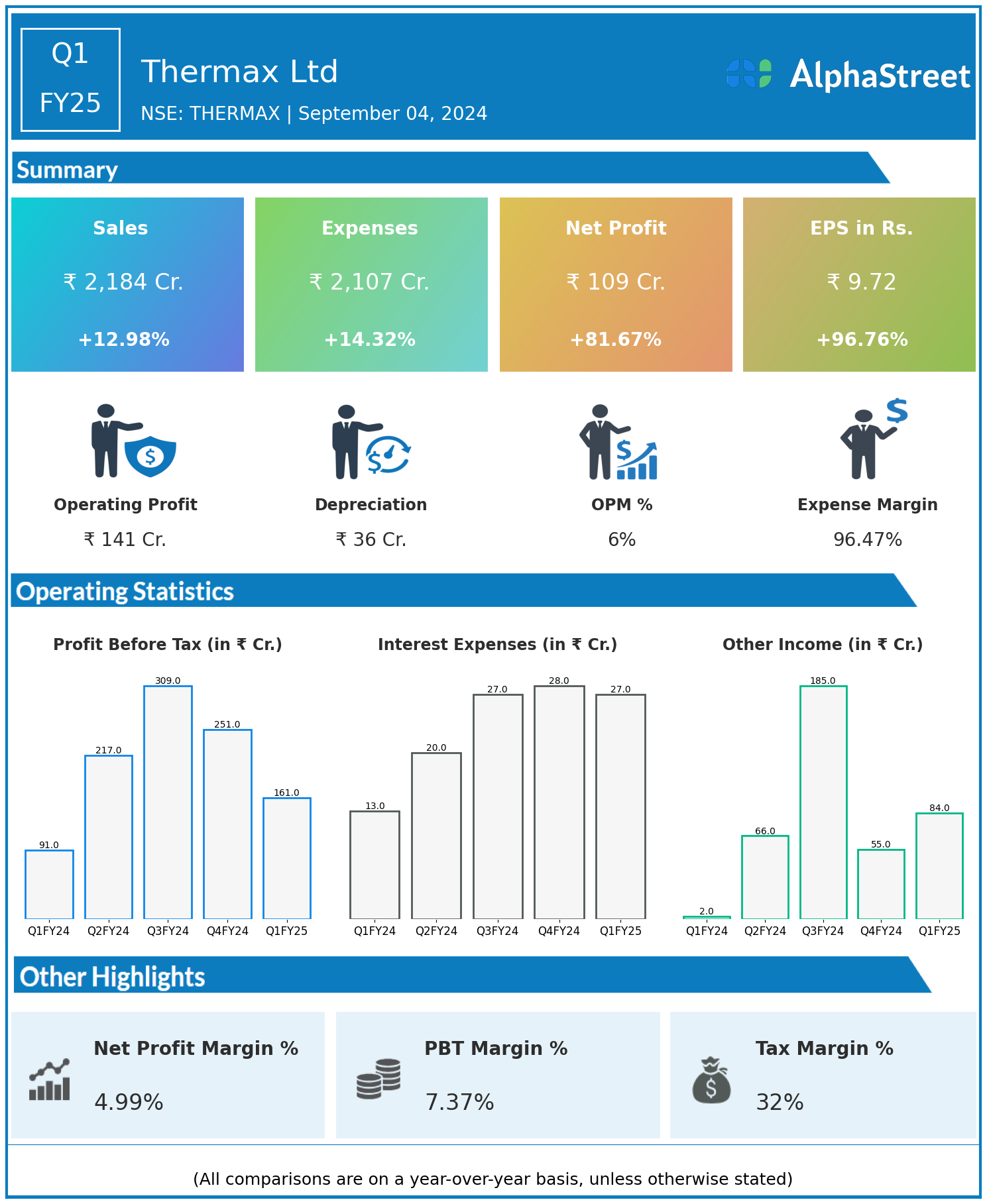 Thermax Ltd reported Revenues for Q1FY25 of ₹2,184.00 Crores up from ₹1,933.00 Crore year on year, a rise of 12.98%.