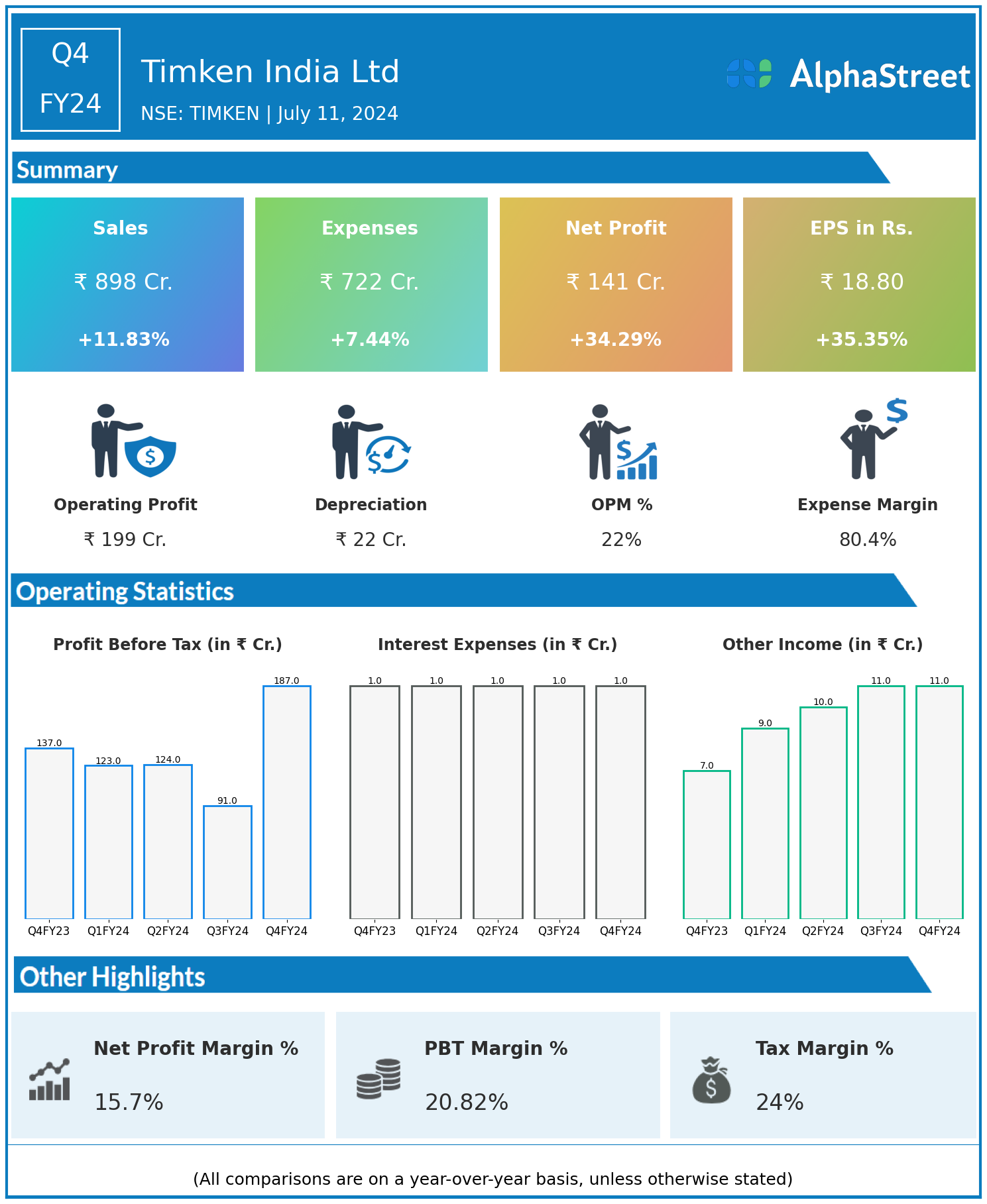 Timken India Ltd reported Revenues for Q4FY24 of ₹898.00 Crores up from ₹803.00 Crore year on year, a rise of 11.83%.