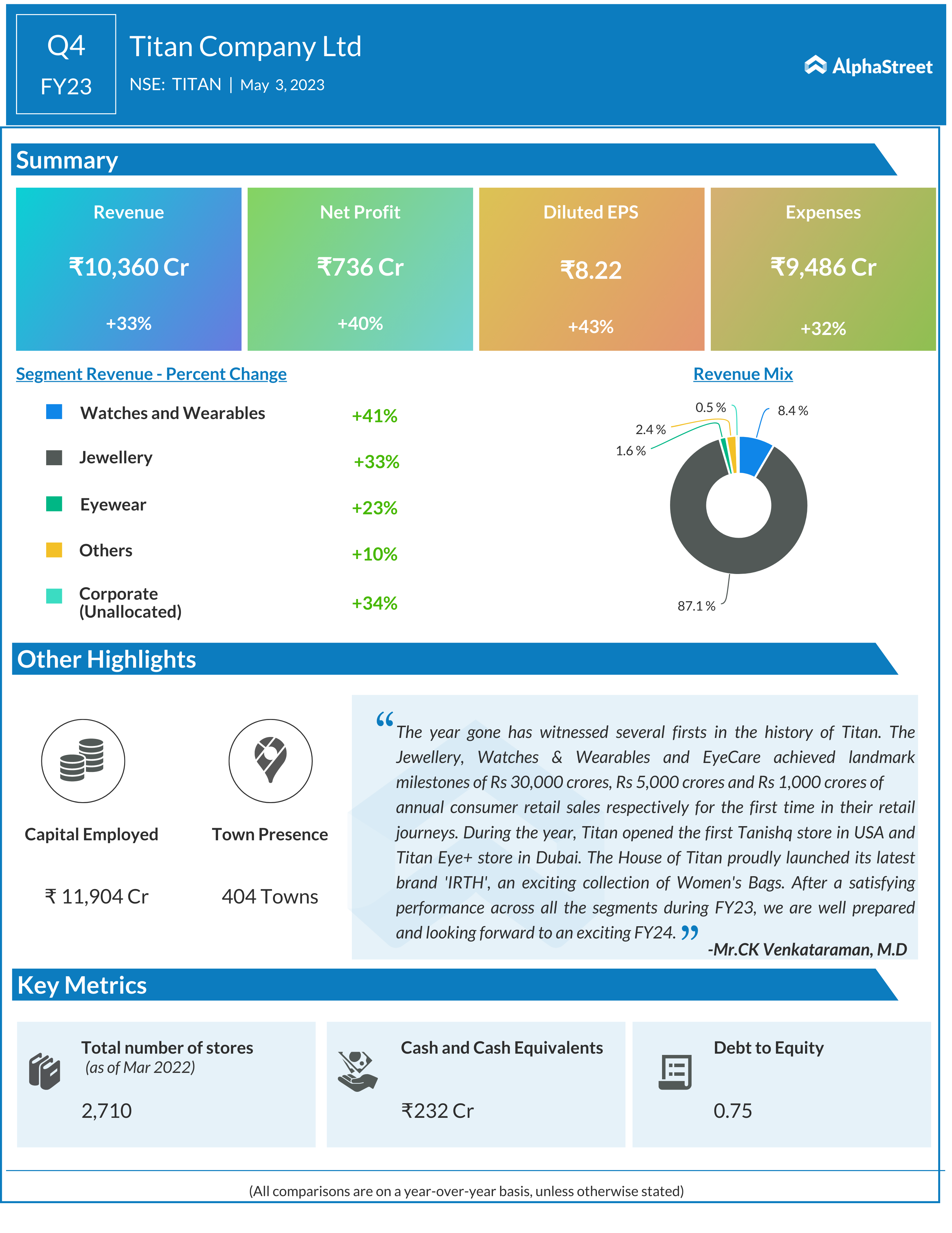 Titan Ltd reported Total revenue for Q4 FY23 of ₹10,360 Crore, up from ₹7,796 Crore year on year depicting a growth of 33%. While the consolidated Net Profit of ₹736 Crore, up 40% from ₹527 Crore in the same quarter of the previous year. The Earnings per Share is ₹8.22, up 43% from ₹5.74 in the same quarter of the previous year.
