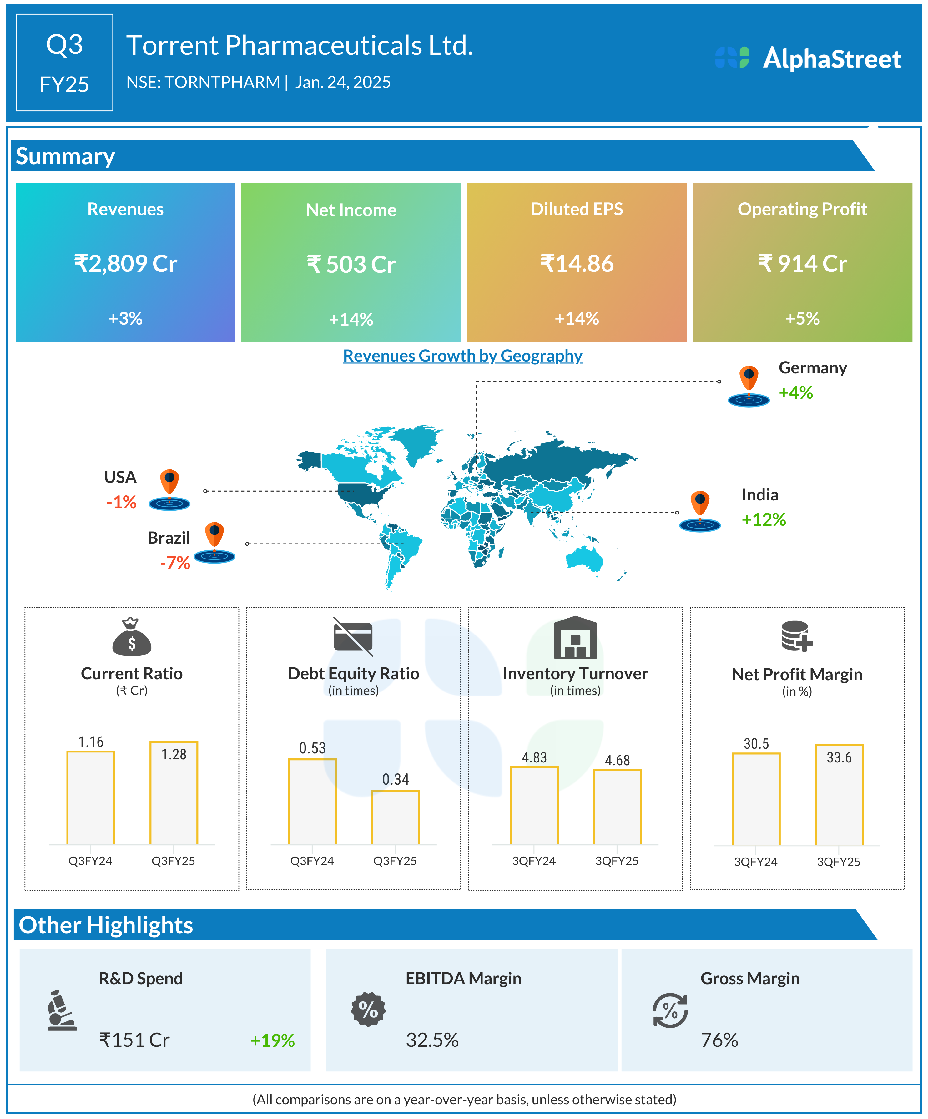 Torrent Pharmaceuticals Ltd reported Revenues for Q3FY25 of ₹2,809.00 Crores up from ₹2,732.00 Crore year on year, a rise of 2.82%.