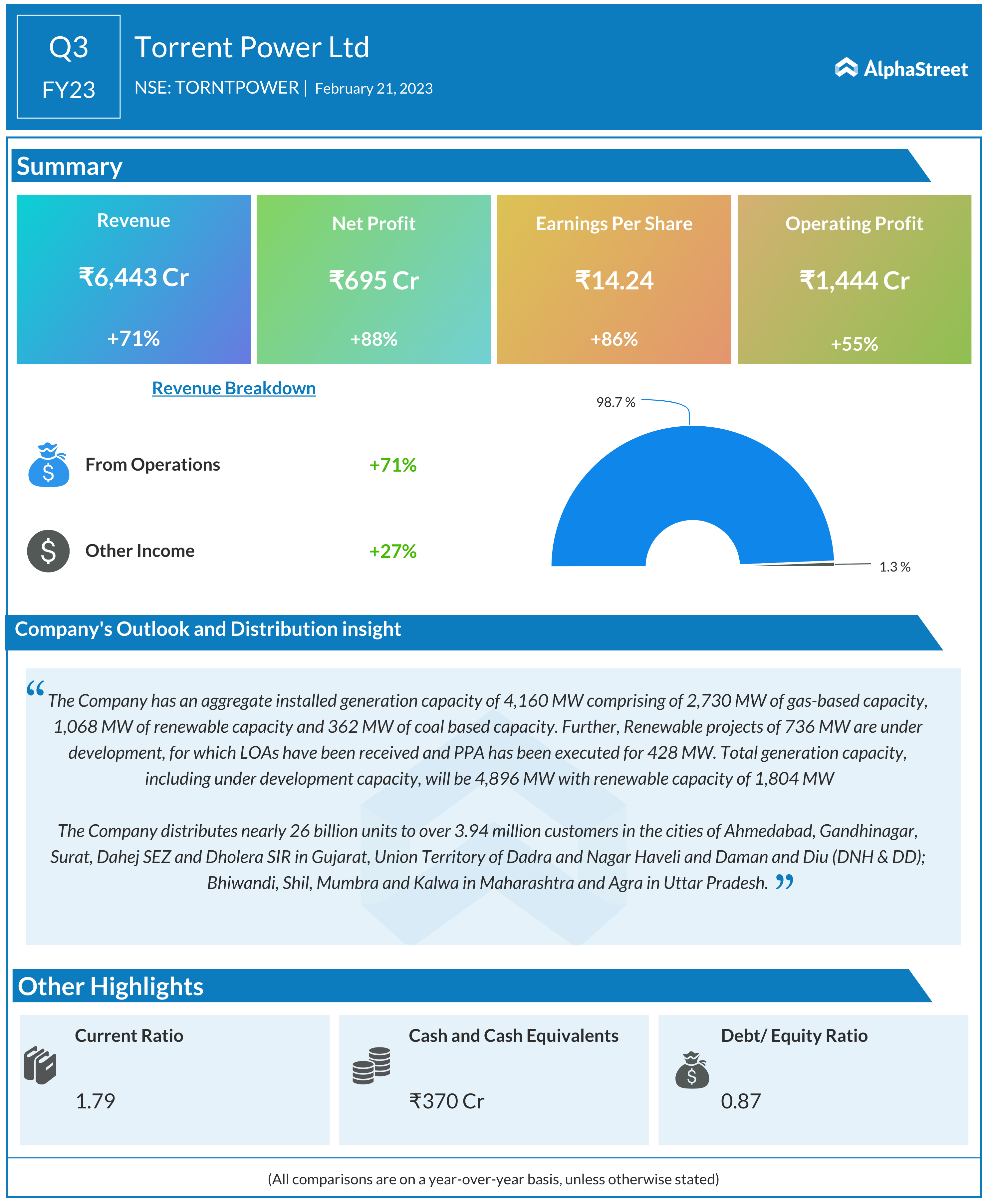 Torrent Power is present across the entire power value chain – generation, transmission, and distribution. The company has an aggregate installed generation capacity of 4,160 MW comprising 2,730 MW of gas-based capacity, 1,068 MW of renewable capacity, and 362 MW of coal-based capacity.