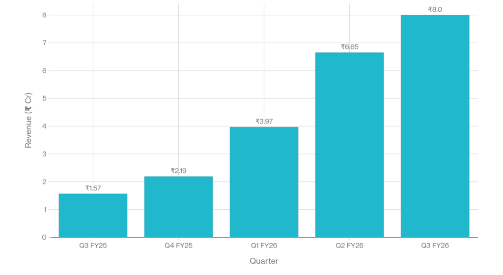 Consolidated revenue for Q3 FY26 (ended December 31, 2025) reached ₹8.00 crore, representing a 409.55% increase from ₹1.57 crore in Q3 FY25 and 20.30% sequential growth from ₹6.65 crore in Q2 FY26. The company achieved net profit after tax of ₹2.41 crore, a dramatic turnaround from ₹0.02 crore in the year-ago quarter. EBITDA rebounded to ₹5.56 crore with a margin of 70.05%, the highest in eight quarters, up from 58.97% in Q2 FY26. The profit-after-tax margin expanded to 30.13%, up substantially from 0.64% in Q3 FY25, underscoring improving operational discipline and cost management. Earnings per share increased to ₹1.47 from ₹0.01 in Q3 FY25.