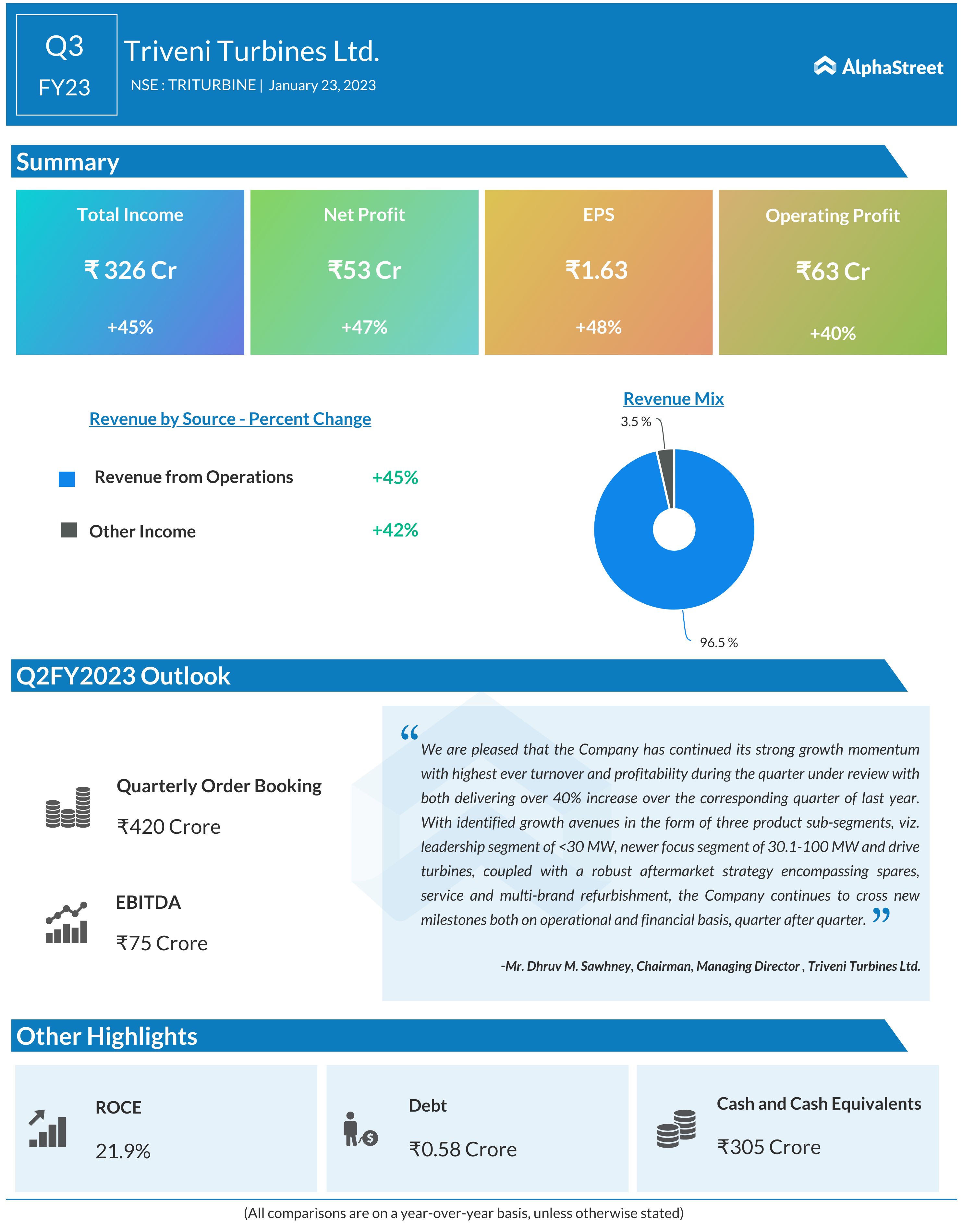 Dhruv M Sawhney, Chairman and Managing Director of Triveni Turbine said the company has continued its strong growth momentum with highest ever turnover and profitability during the quarter under review with both rising more than 40 per cent over the corresponding quarter of last year. The identified growth avenues are mainly three product sub-segments — leadership segment in less than 30 MW, newer focus segment of 30.1-100 MW and drive turbines. Besides, with a robust aftermarket strategy encompassing spares, service and multi-brand refurbishment, the company continues to cross new milestones both on operational and financial basis, he noted.