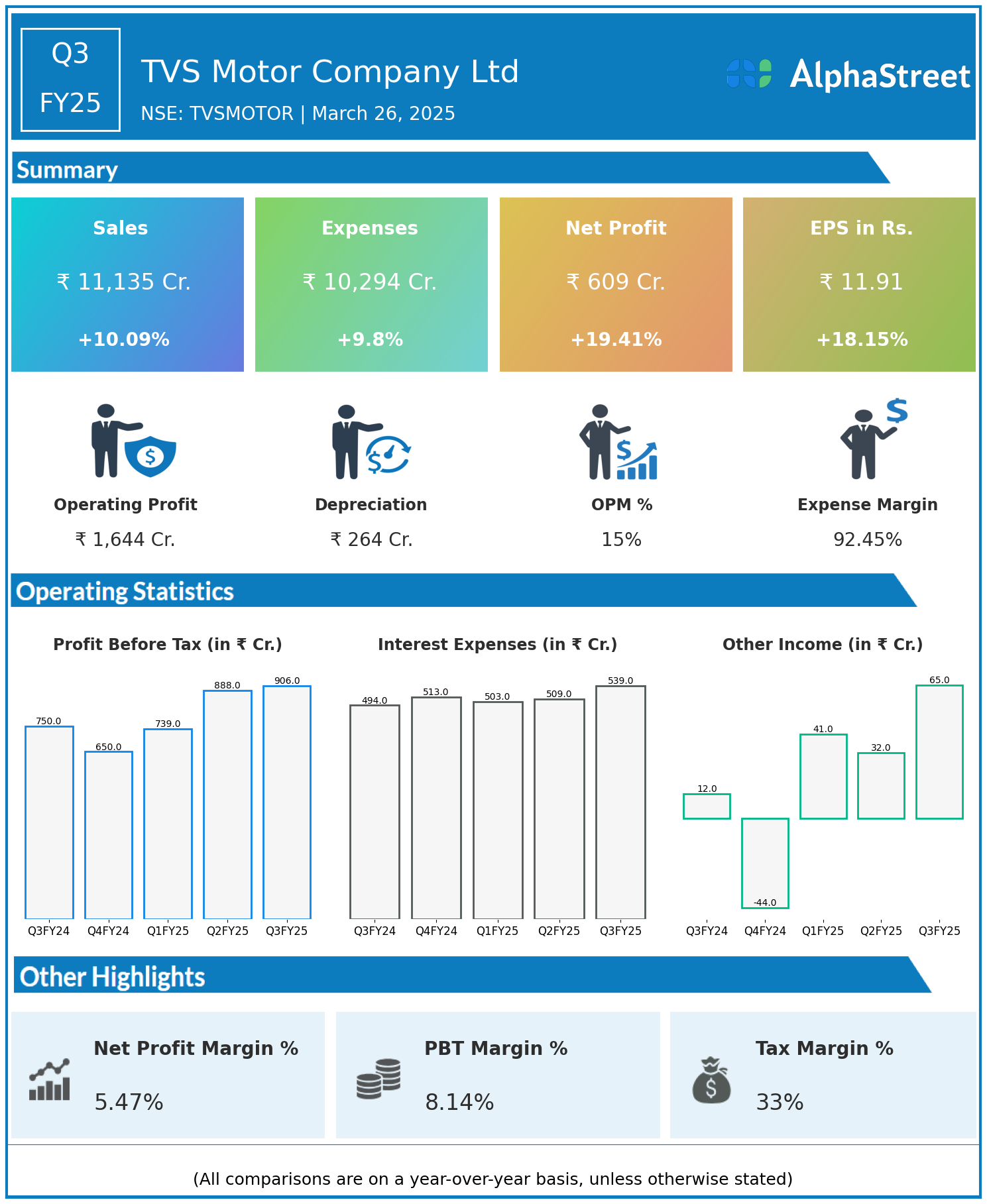 TVS Motor Company Ltd reported Revenues for Q3FY25 of ₹11,135.00 Crores up from ₹10,114.00 Crore year on year, a rise of 10.09%.