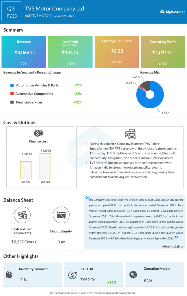 Two and three wheeler major TVS Motor Company clocked a net profit of nearly 304 crore in the third quarter of fiscal 2022-23, up 28% from the 237 crore clocked in the year-ago quarter. Sequentially however, Q3 PAT was down 18.4% compared to Q2 tally of nearly 373 crore.