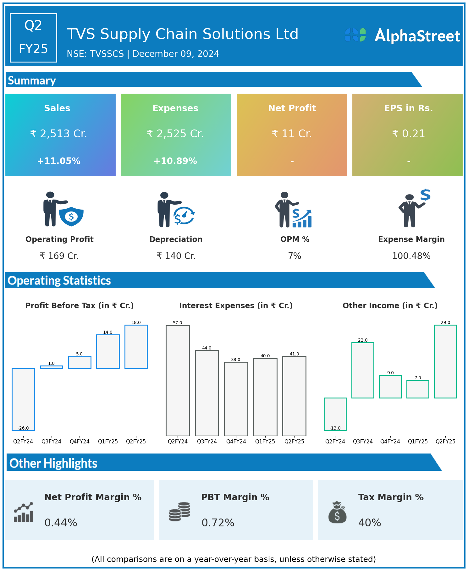 TVS Supply Chain Solutions Ltd reported Revenues for Q2FY25 of ₹2,513.00 Crores up from ₹2,263.00 Crore year on year, a rise of 11.05%.