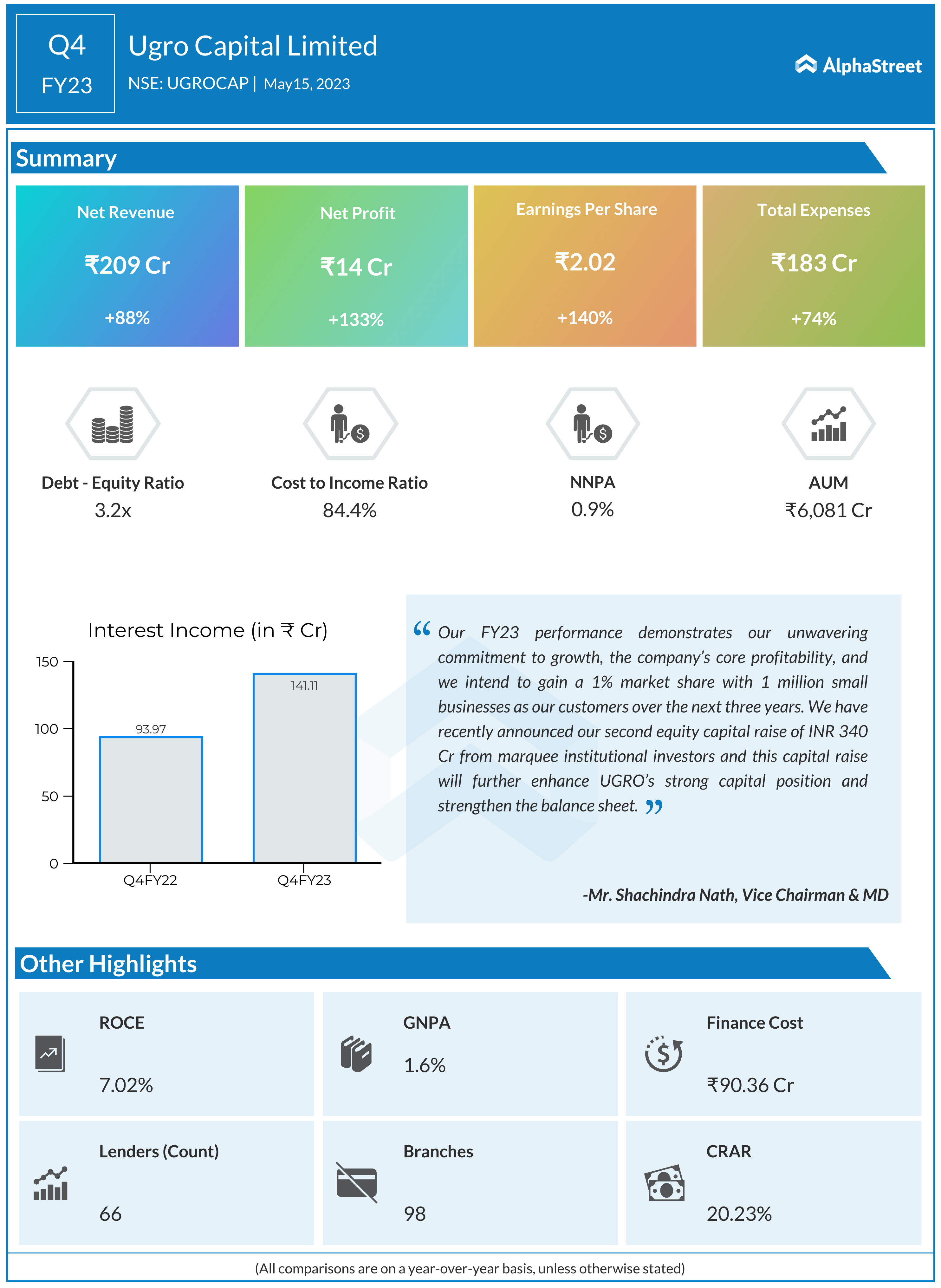 Ugro Capital Ltd reported Total revenue for Q4 FY23 of ₹209 Crore, up from ₹111 Crore year on year depicting a growth of 88%. Consolidated Net Profit of ₹14 Crore, up 133% from ₹6 Crore in the same quarter of the previous year. The Earnings per Share is ₹2.02, up 140% from ₹0.84 in the same quarter of the previous year.