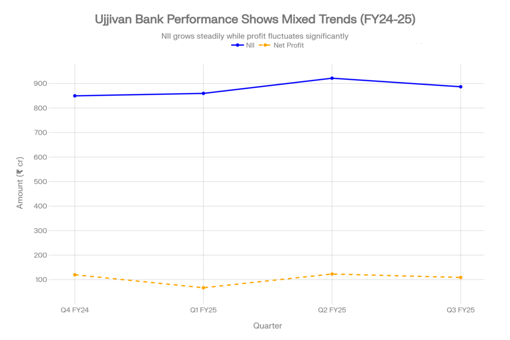 Net Interest Income rose 3.1% YoY to ₹887 crore, while Net Interest Margin compressed to 8.6% from portfolio rebalancing toward secured but lower-yielding products. Provisions increased to ₹223 crore from ₹63 crore in the year-ago period, reflecting elevated credit costs in the microfinance segment. Net profit declined 64% YoY to ₹109 crore, though this represented a modest improvement from the ₹67 crore recorded in Q1 FY25.