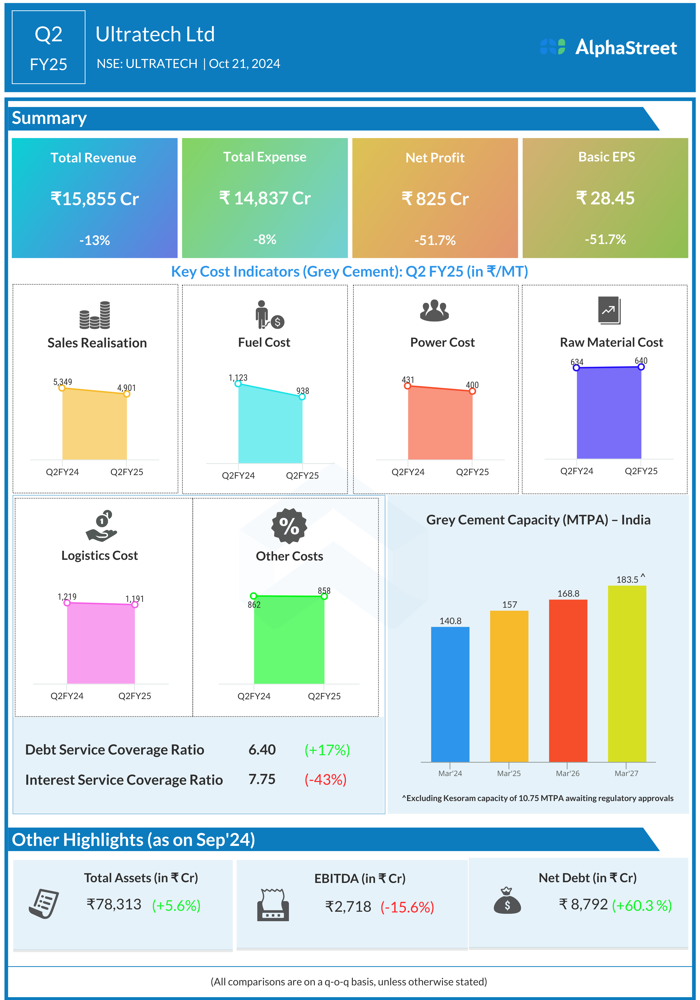 UltraTech Cement Ltd reported a Total Revenue for Q2FY25 of ₹ 15,855 Crore down from ₹ 18,235 Crore quarter on quarter, a fall of 13%.