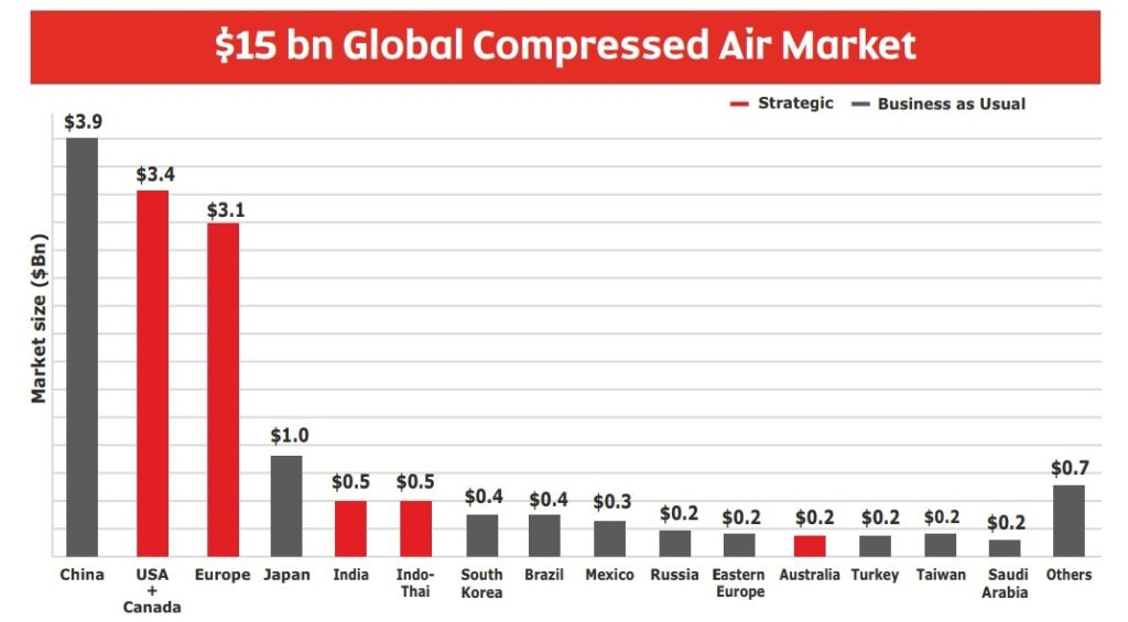 Elgi’s primary focus is on North America, Australia, South East Asia and Europe which accounts for more than 50% of the global opportunity. Below are the countries with a large market in the air-compressor industry.