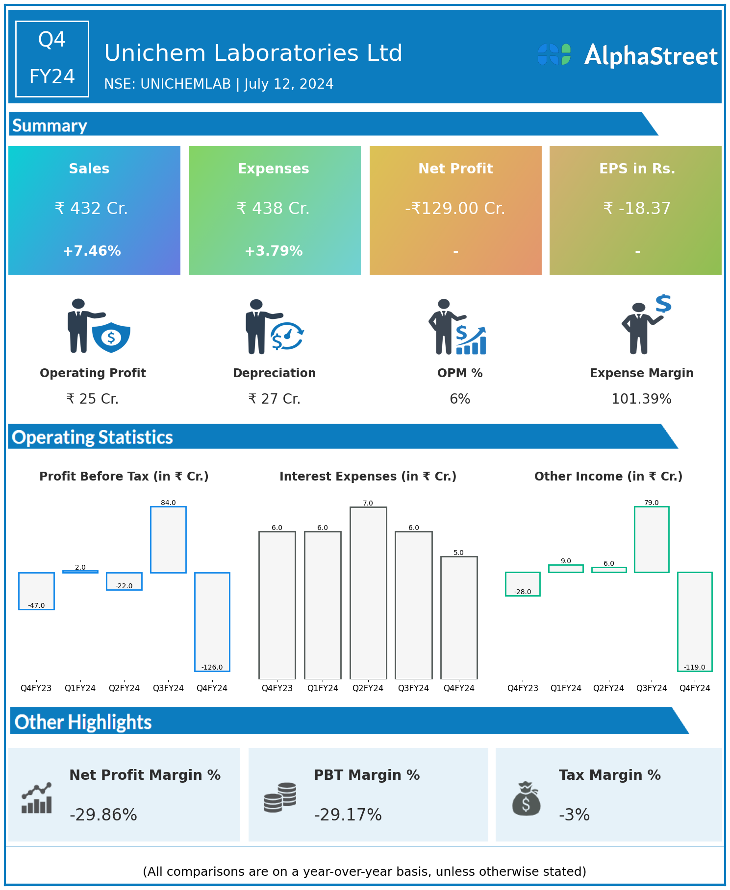 Unichem Laboratories Ltd reported Revenues for Q4FY24 of ₹432.00 Crores up from ₹402.00 Crore year on year, a rise of 7.46%.