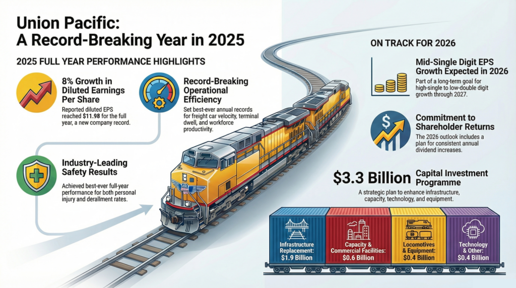 Union Pacific’s 2025 results included record net income and operational efficiency improvements. The company generated $9.3 billion in cash from operations and returned $4.7 billion to shareholders. The adjusted debt-to-EBITDA ratio remained 2.7, matching 2024 levels. The company remains consistent with EPS compound annual growth targets through 2027. Full-year return on equity reached 40.4%.