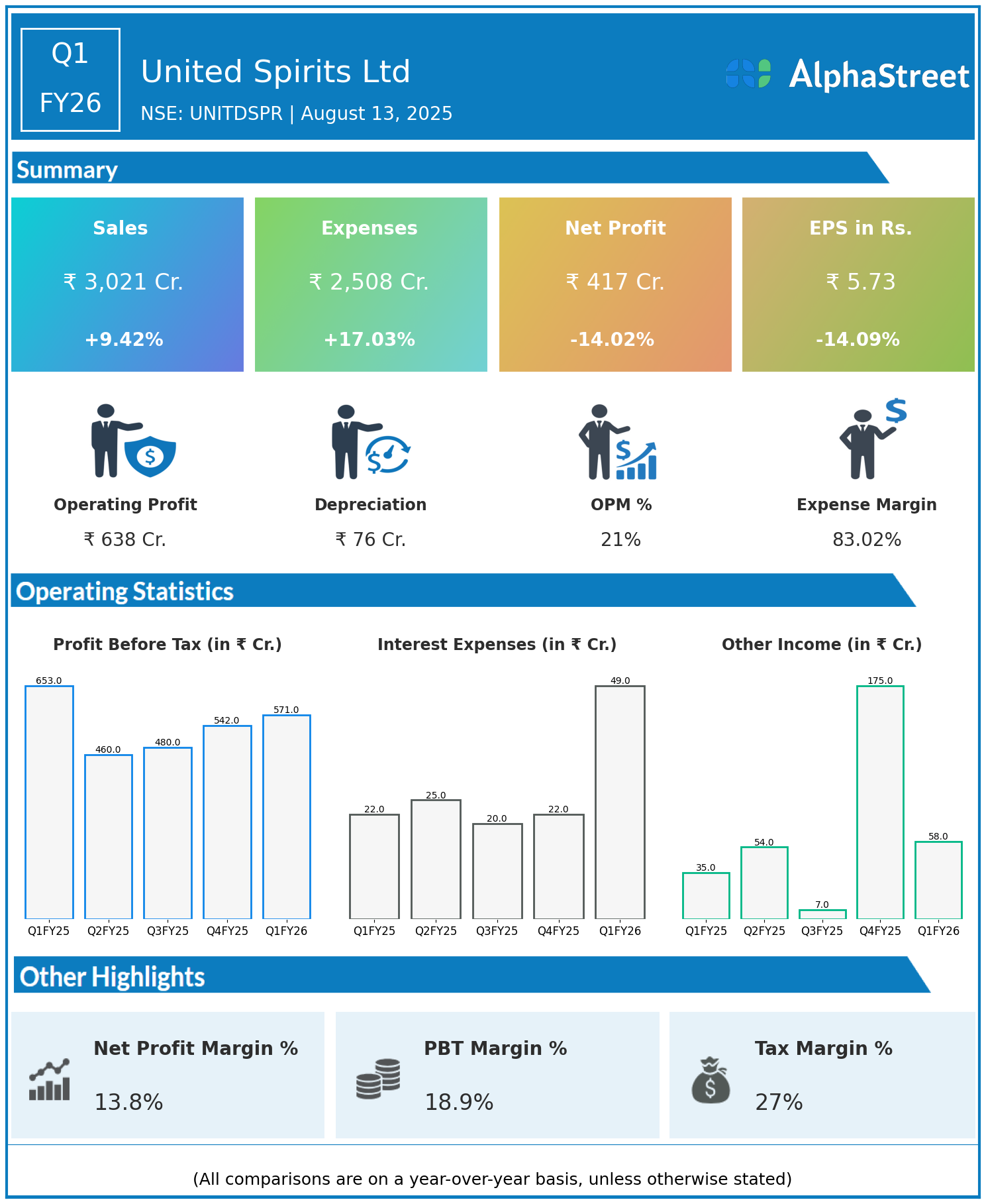 Diageo India incorporated in India as United Spirits Ltd.(USL) is the country’s leading beverage alcohol company and a subsidiary of global leader Diageo PLC. The company manufactures, sells, and distributes a wide portfolio of premium brands such as Johnnie Walker, Black Dog, Black & White, VAT 69, Antiquity, Signature, Royal Challenge, McDowell’s No.1, Smirnoff and Captain Morgan. Presenting below are its Q1 FY26 earnings results.