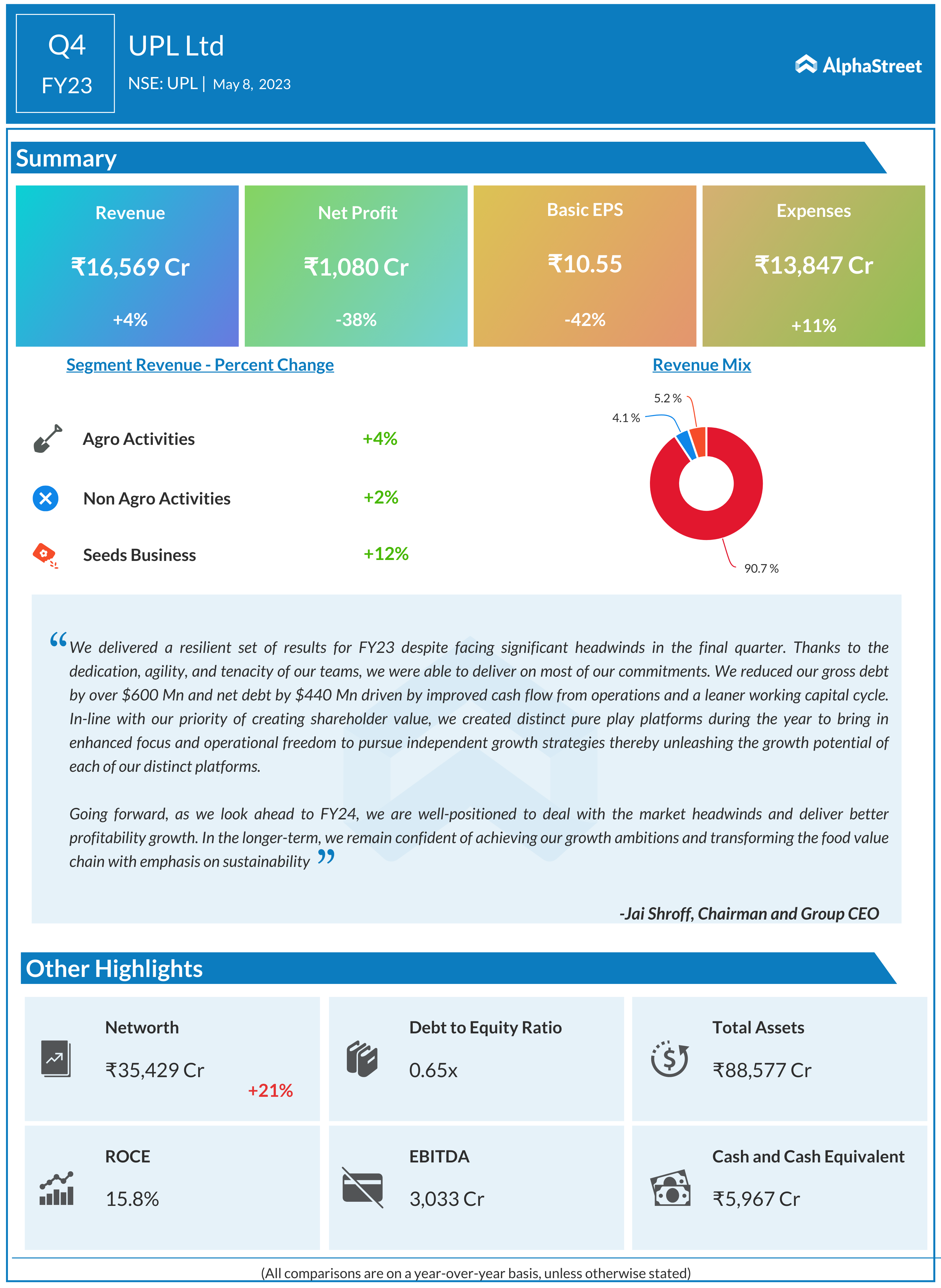 UPL reported Total revenue for Q4 FY23 of ₹16,569 Crore, up from ₹15,861 Crore year on year depicting a growth of 4%. Consolidated Net Profit of ₹1,080 Crore, down 38% from ₹1,735 Crore in the same quarter of the previous year. The Earnings per Share is ₹10.55, down 42% from ₹18.05 in the same quarter of the previous year.