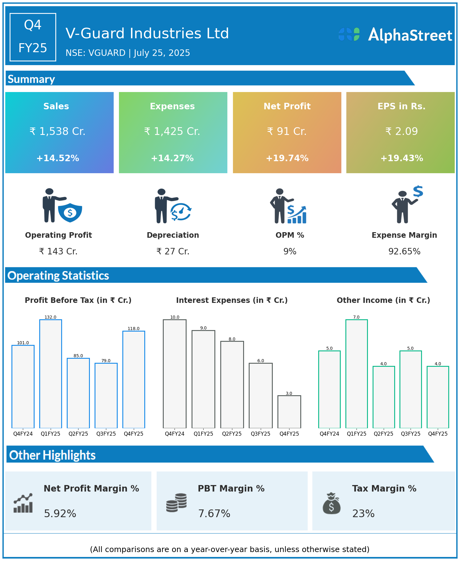 V-Guard Industries Ltd reported Revenues for Q4FY25 of ₹1,538.00 Crores up from ₹1,343.00 Crore year on year, a rise of 14.52%.