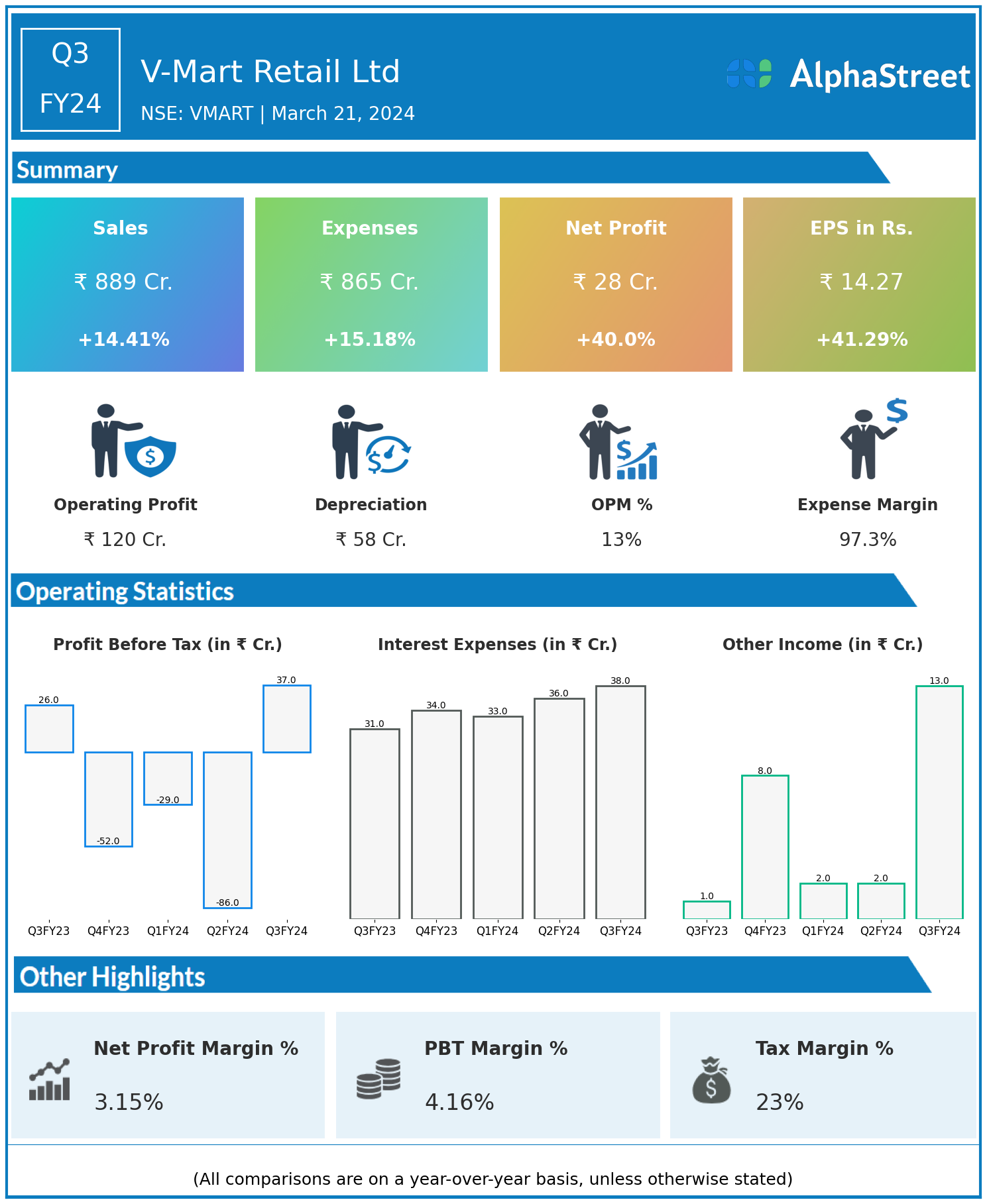 V-Mart Retail Ltd reported Revenues for Q3FY24 of ₹889.00 Crores up from ₹777.00 Crore year on year, a rise of 14.41%.