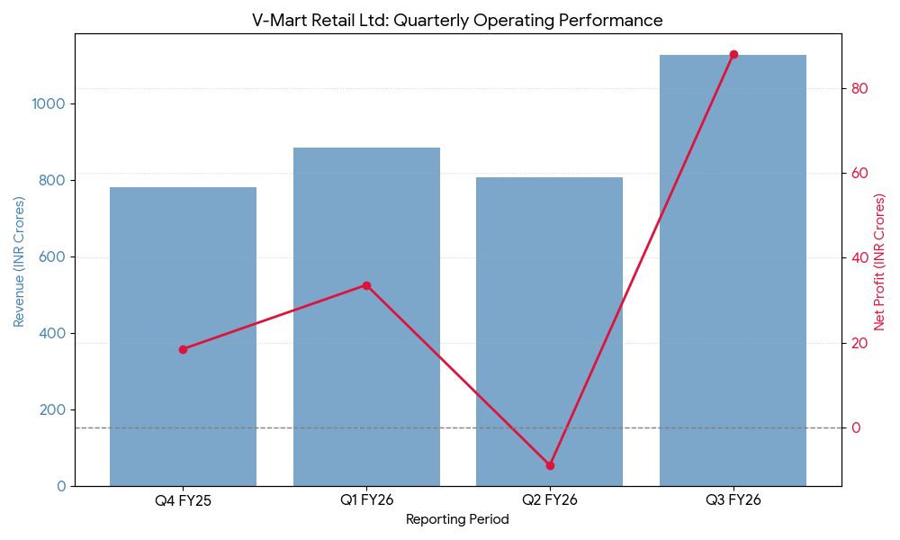For the quarter ended December 31, 2025, V-Mart Retail reported consolidated revenue from operations of 1,126.38 crore rupees. This represents a 9.71 percent increase compared to the 1,026.73 crore rupees recorded in the same period of the previous fiscal year. Consolidated net profit reached 87.99 crore rupees, a 22.83 percent growth over the 71.63 crore rupees reported in the year-ago quarter.