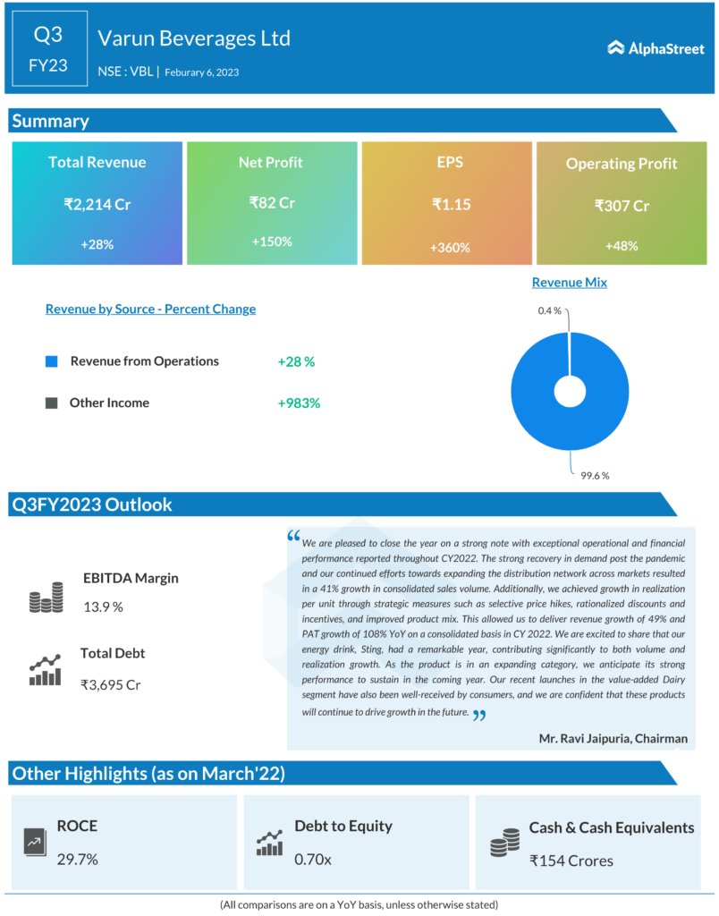 One of the largest franchisees of PepsiCo Varun Beverages reported a 150% year-on-year (YoY) increase in its consolidated profit after tax at INR 81.5 crore for the quarter ended December 31, 2022. The company had reported a net profit of INR 32.5 crore in the same quarter of the previous fiscal year.