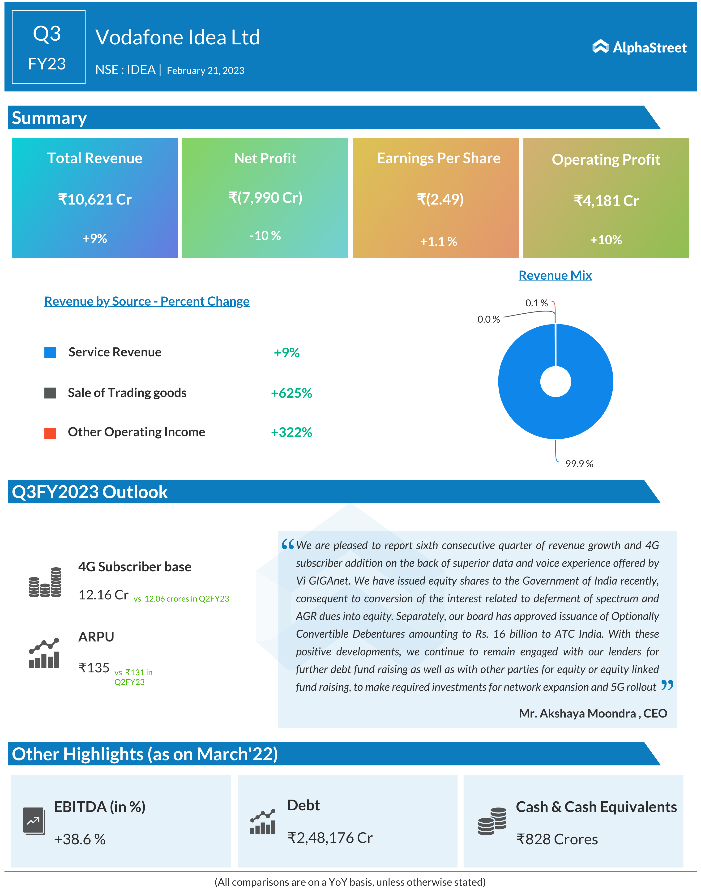 Telecom firm Vodafone Idea’s net loss widened to INR 7,990 crore in the quarter ended December 31, 2022 as against INR 7,595.5 crore in the year-ago period. The company’s revenue rose 9% to INR 10,621 crore in Q3FY23 as compared to INR 9,717 crore in Q3FY22. ARPU (average revenue per user) for the quarter stood at INR 135 vs INR 131 in Q2FY23 and INR 115 in Q3FY22, a YoY growth of 17.4%.
