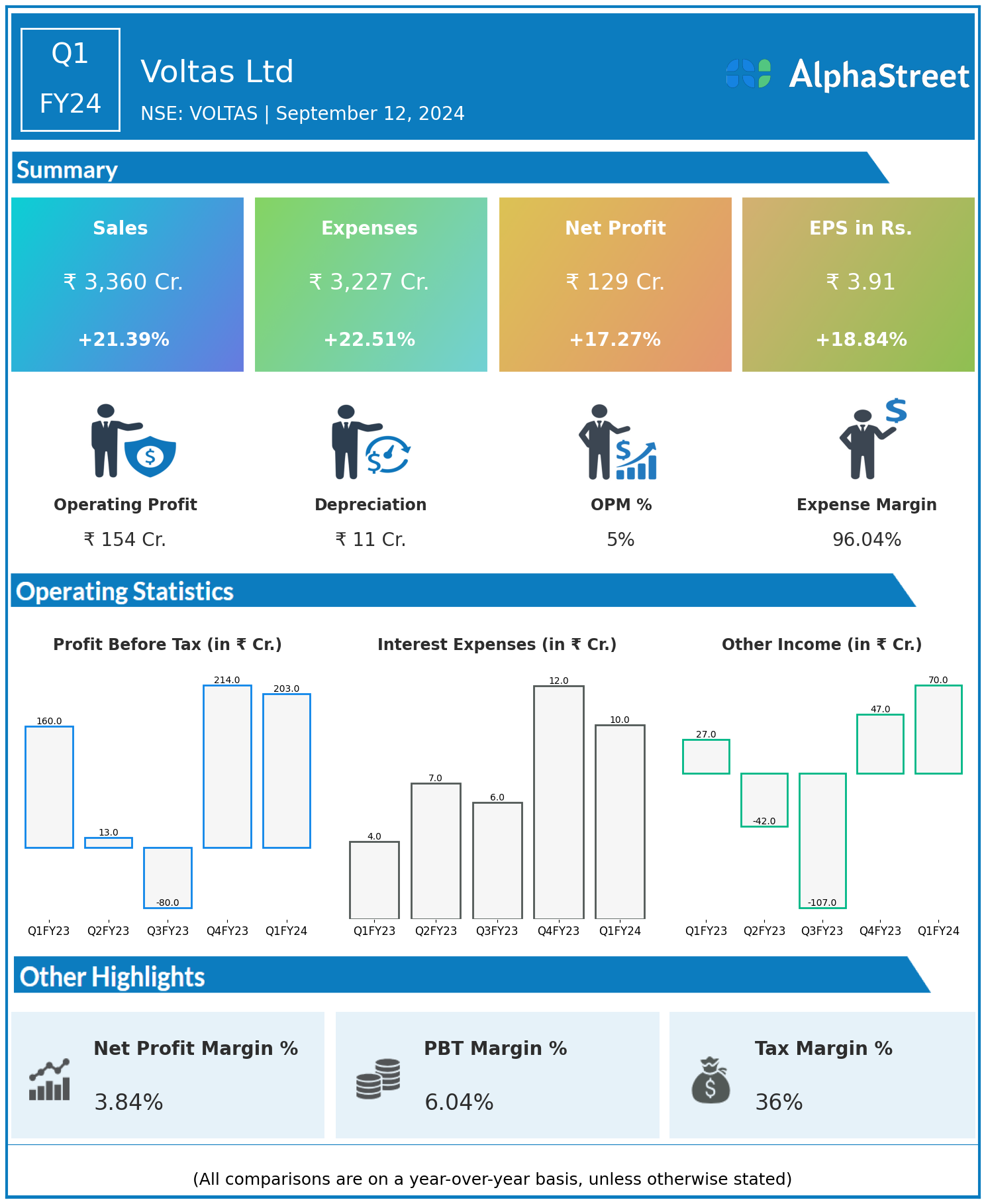 Voltas Ltd reported Revenues for Q1FY24 of ₹3,360.00 Crores up from ₹2,768.00 Crore year on year, a rise of 21.39%.