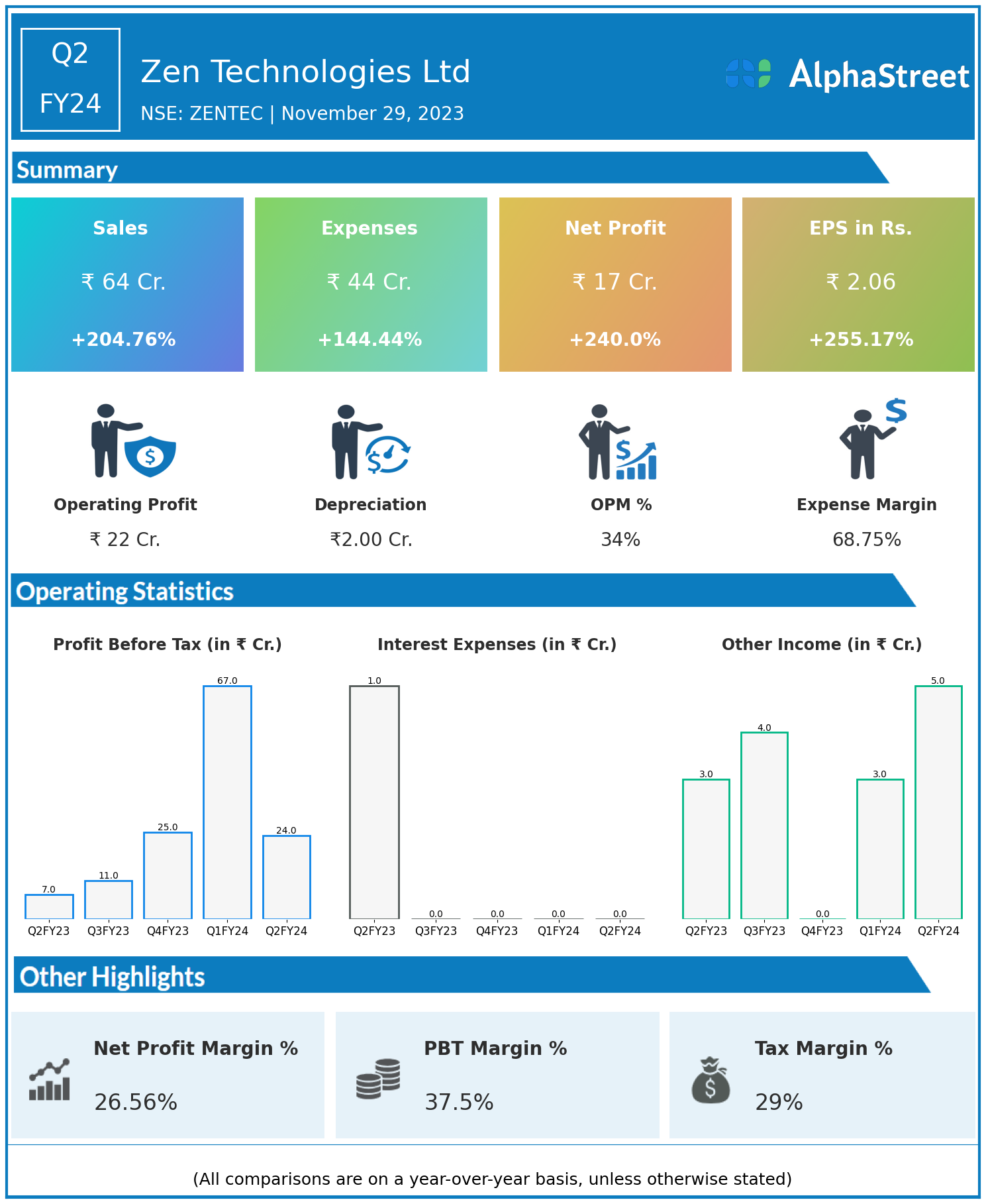 Zen Technologies Ltd reported Revenues for Q2FY24 of ₹64.00 Crores up from ₹21.00 Crore year on year, a rise of 204.76%.