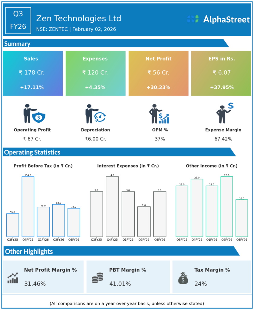 Zen Technologies reported solid Q3 performance with revenue growth and strong order inflows despite some sequential profit moderation. Key financials reflect robust YoY gains in defence simulator and anti-drone segments.