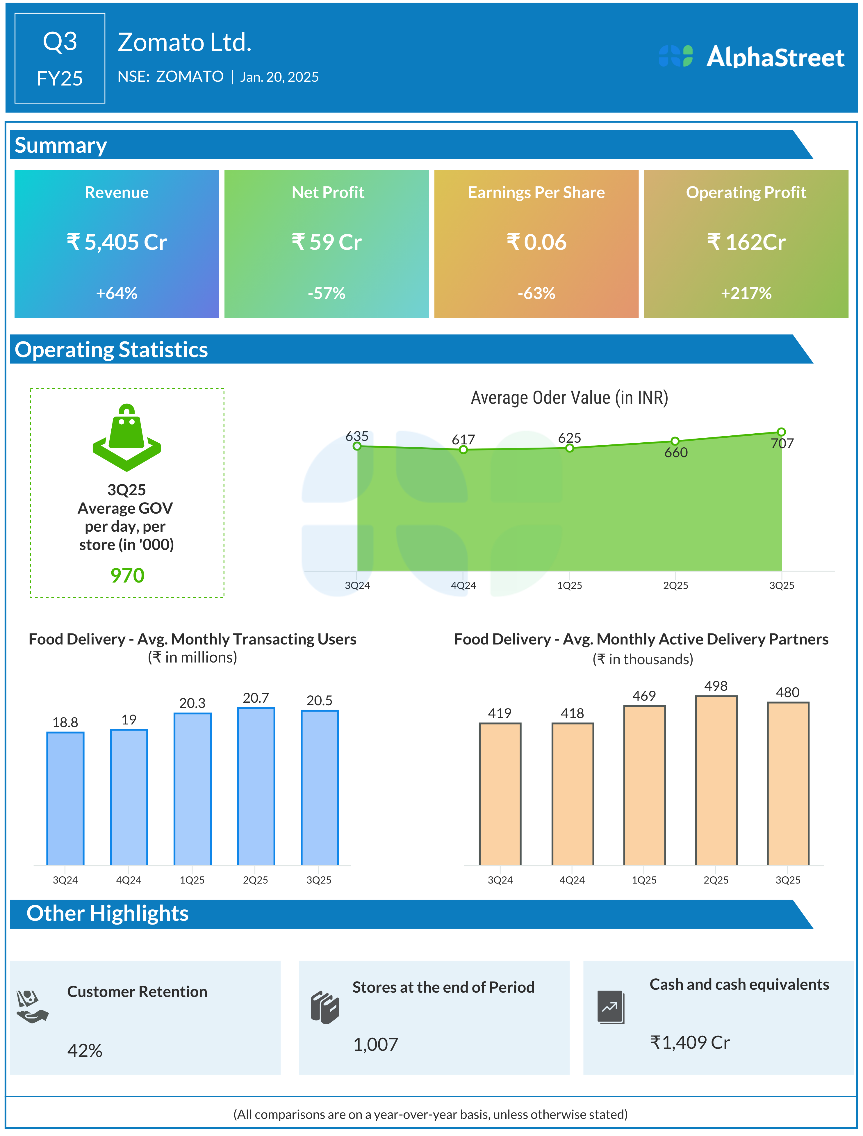 Zomato Ltd reported Revenues for Q3FY25 of ₹5,405.00 Crores up from ₹3,288.00 Crore year on year, a rise of 64.39%.