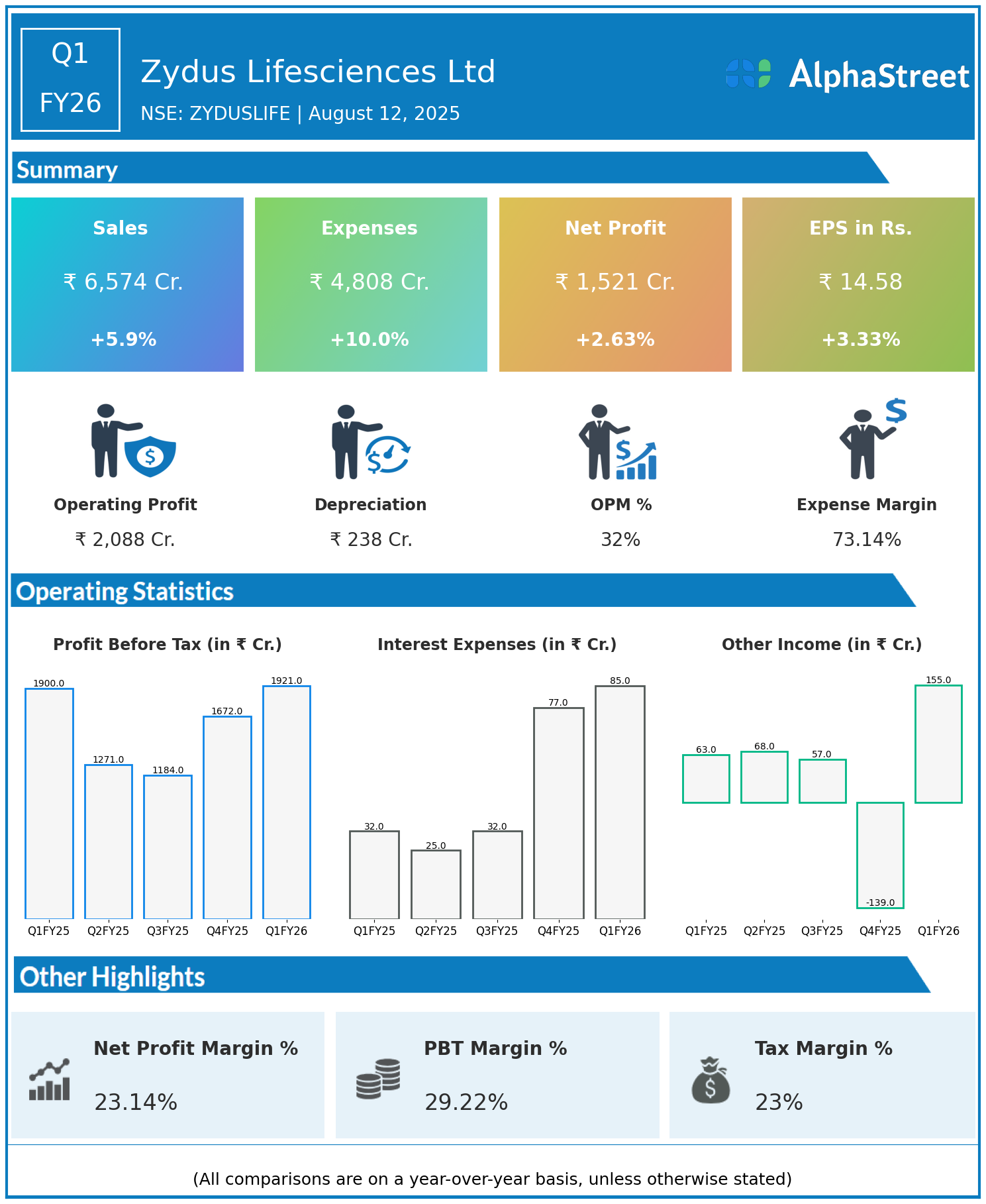 Revenue from Operations: ₹6,574 crore, up 5.9% year-over-year (YoY) from ₹6,207 crore in Q1 FY25, and slightly up 0.7% quarter-on-quarter (QoQ) from ₹6,527 crore.